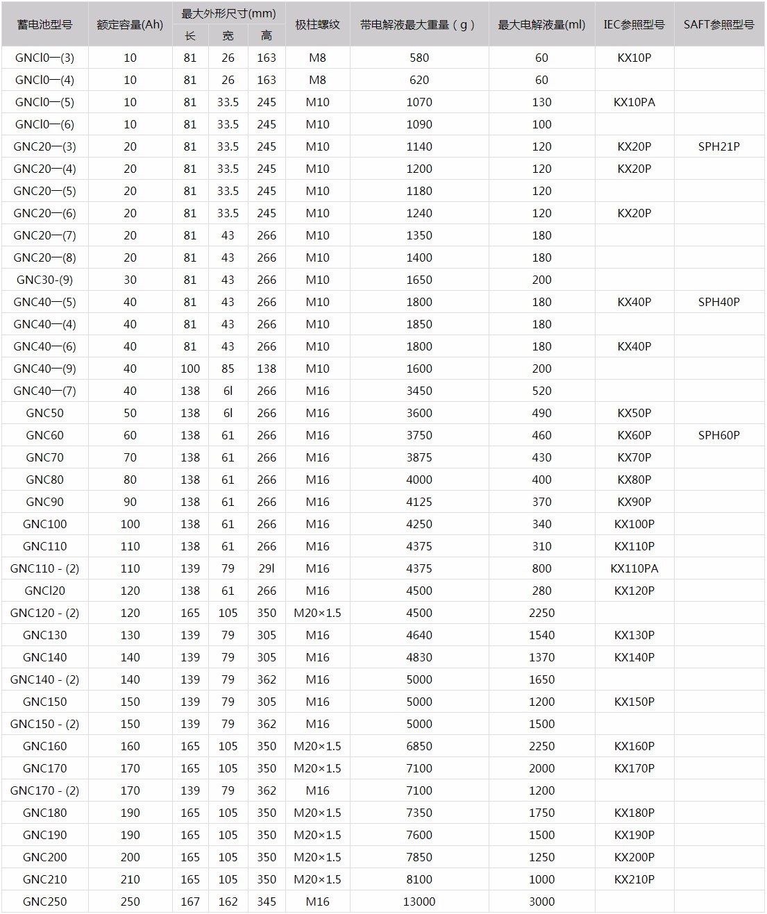 低倍率蓄電池(組)的外形尺寸、重量及有關(guān)參數(shù)